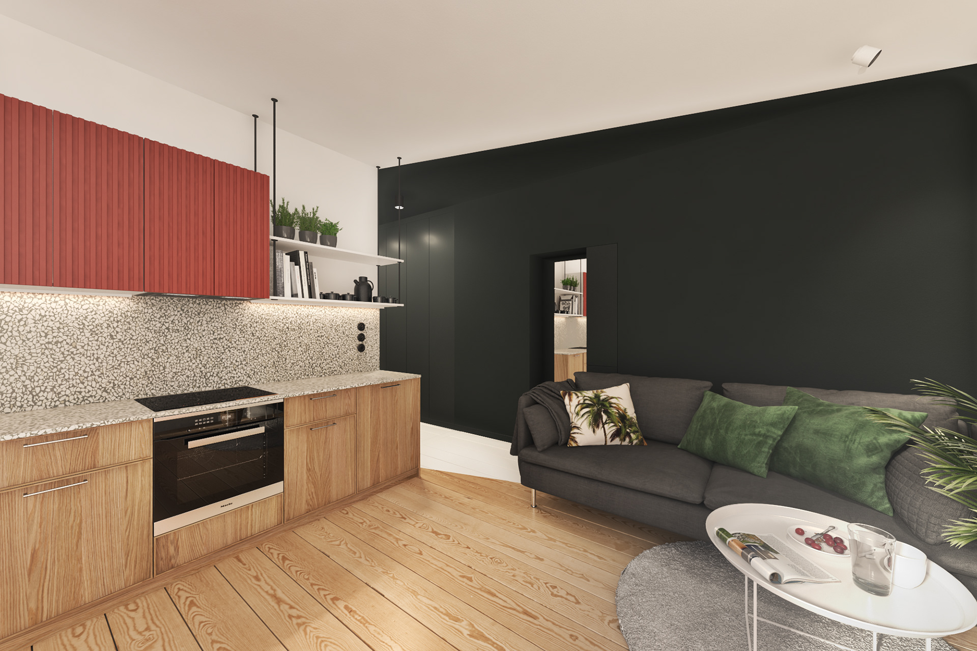 Projekt aranżacji wnętrza mieszkania mieszczącego się na zabytkowym osiedlu im. Józefa Montwiłła-Mireckiego w Łodzi. Jest to miejsce natchnione historią dlatego jednym z priorytetów było zachowanie dawnego charakteru wnętrza oraz wkomponowanie w całość nowoczesnych elementów. W mieszkaniu zastaliśmy oryginalną stolarkę drzwiową i okienną, natomiast spod warstw linoleum i płyt podłogowych wydobyliśmy zachowaną w dobrym stanie posadzkę z desek sosnowych. Motywem przewodnim mieszkania są wielkoformatowe płyty imitujące lastryko, czerwono-wiśniowe elementy meblowe oraz wszechobecna biel. W kompaktowym mieszkaniu udało się wydzielić słoneczną część dzienną z jadalnią i aneksem kuchennym, niewielką sypialnię oraz przestronną łazienkę z prysznicem.